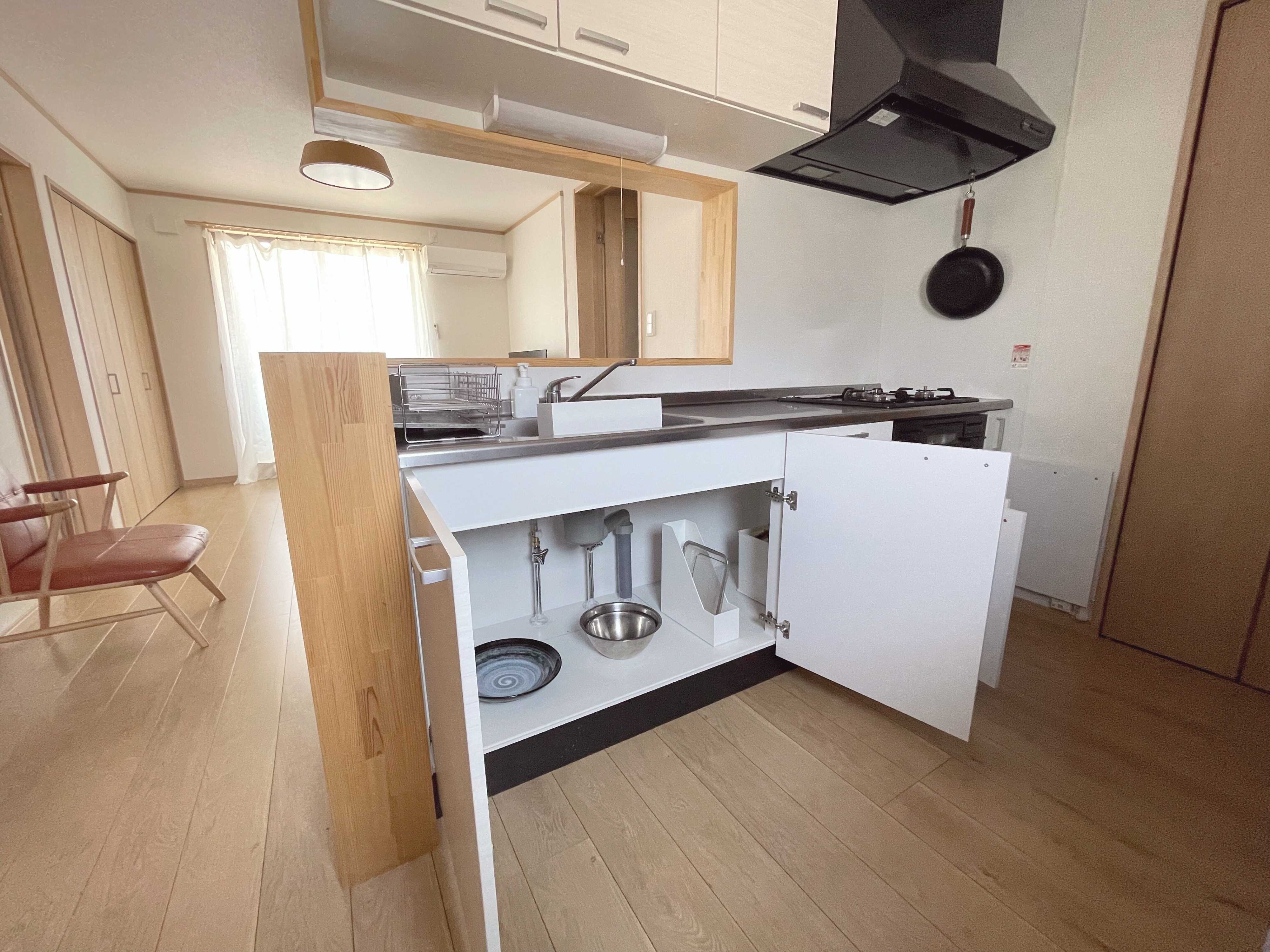 おかげでキッチンの下はガラガラ状態。開き扉には棚を設置する必要もなくなり管理がラクになりました。