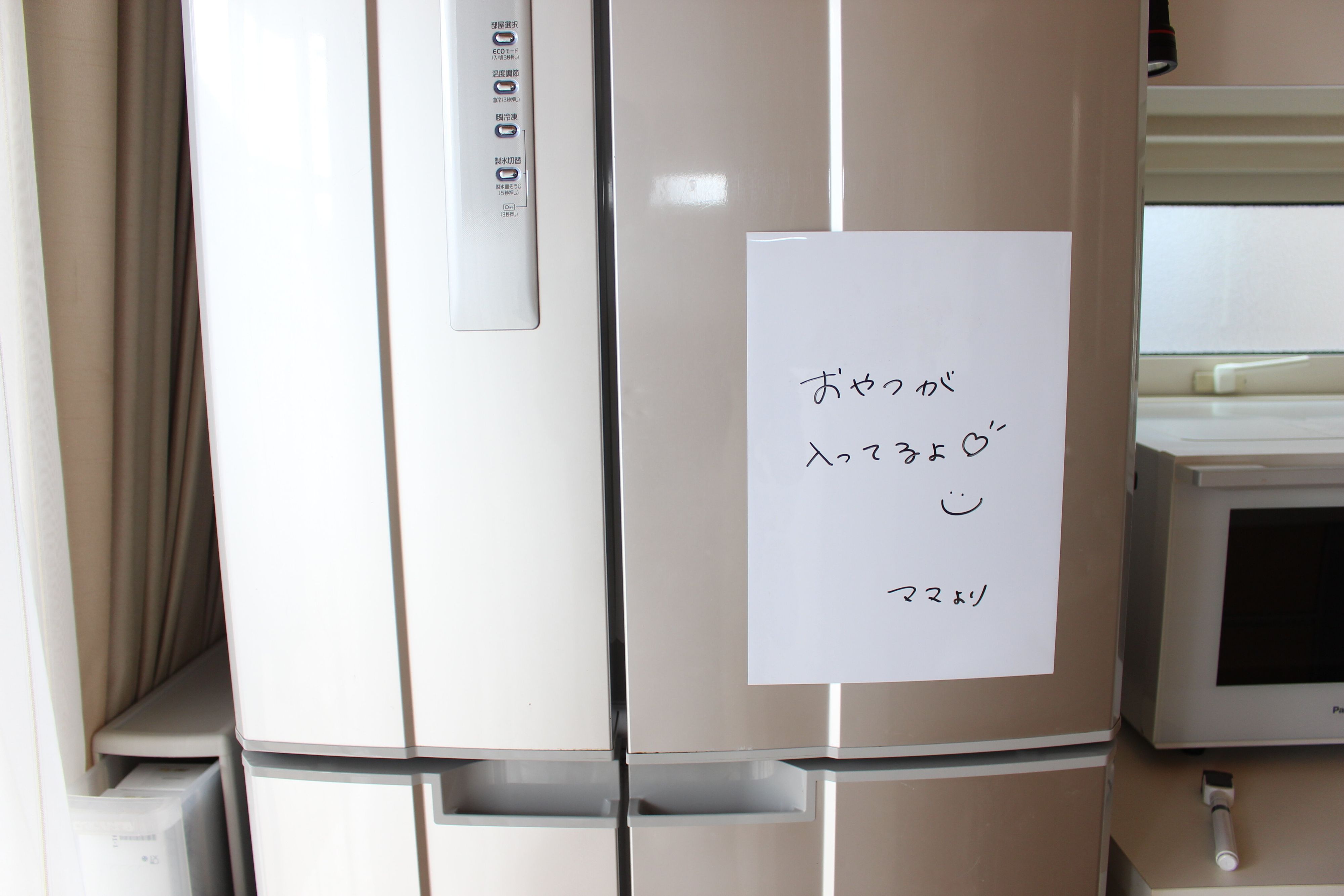 子ども達への伝言や、夜遅く帰宅した夫へのメモとして使っているのがこちらのホワイトボード。薄くてかさばらないので、普段使っていない時は、側面の見えない位置に貼り付けてあります。伝言メモでいちいち紙を使うより、書いて消せるこちらの方が使いやすく気に入っています。