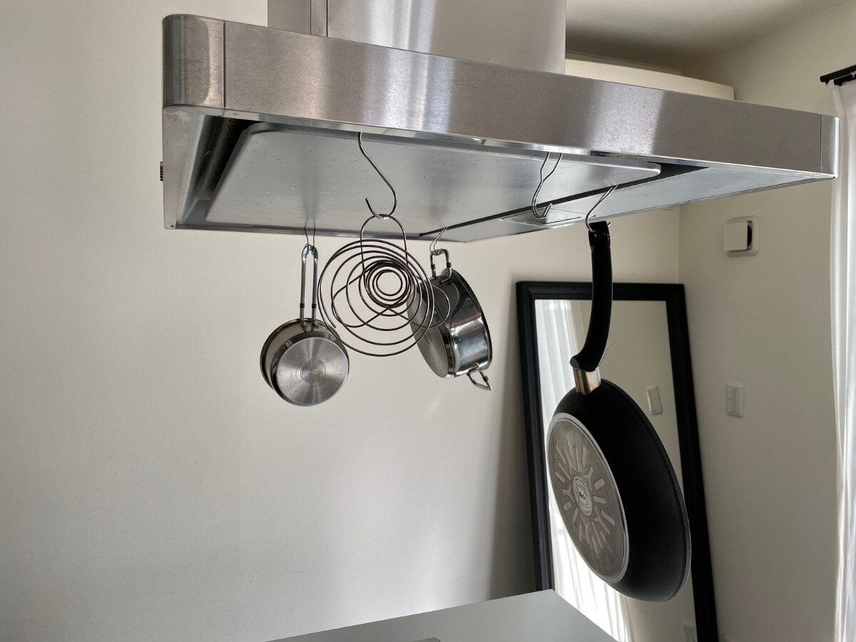 鍋はレンジフードに吊るしているのですが、この鍋はここのフックにかけると場所を固定。