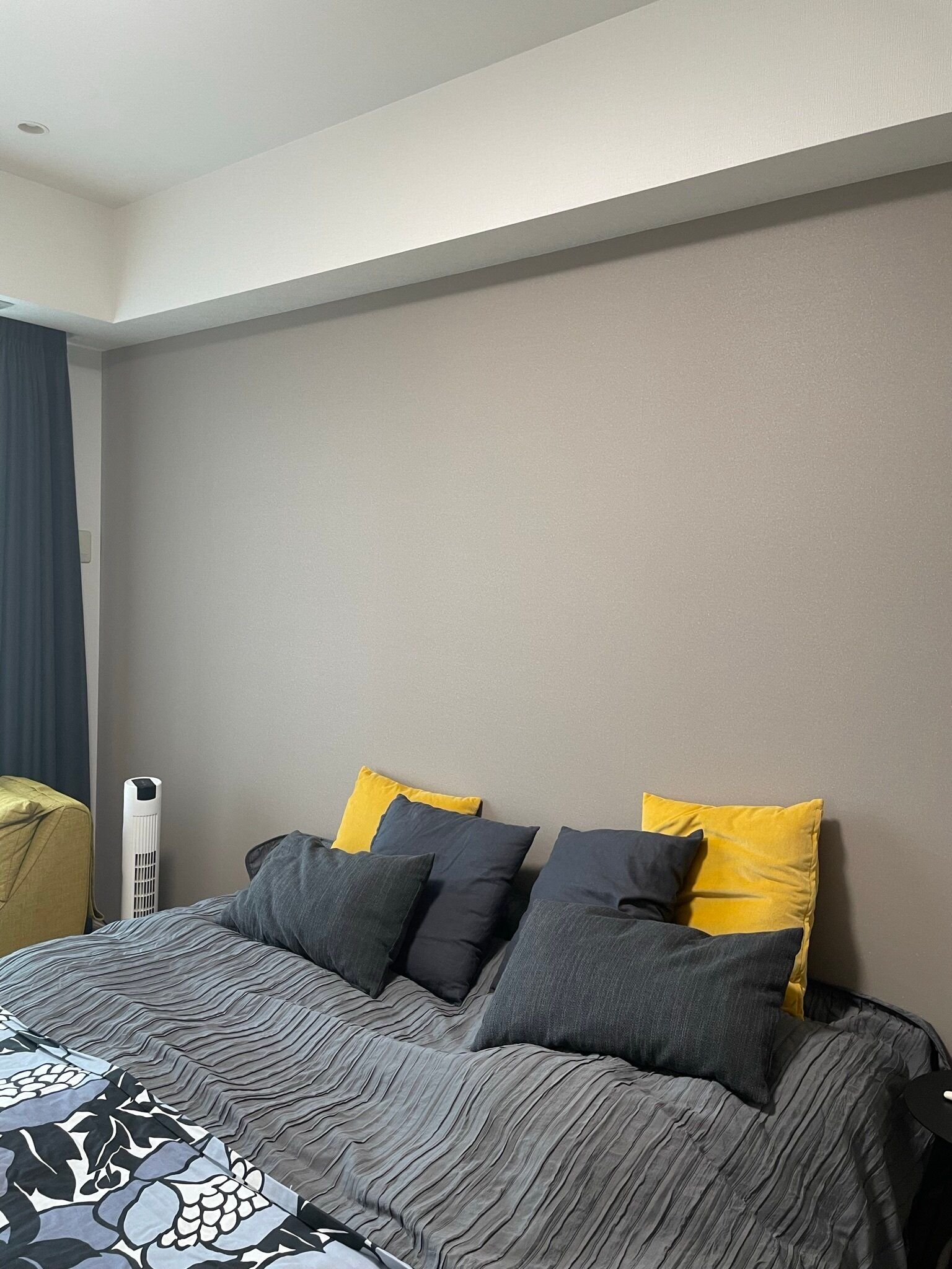 我が家の寝室では、枕元の壁のみダークカラーにしています