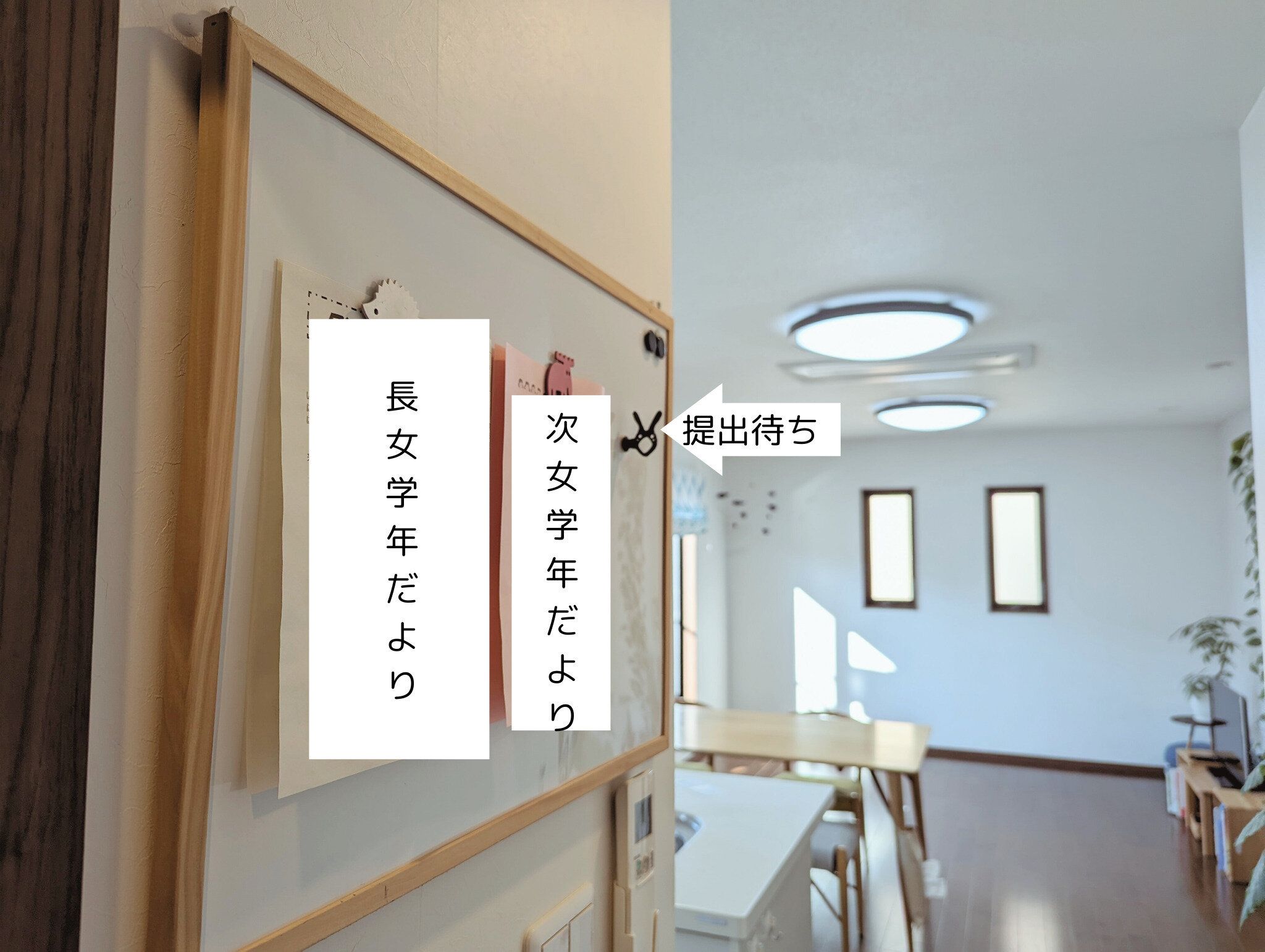 学年だよりは①提出物と同じキッチン横のホワイトボード、給食だよりは冷蔵庫横が定位置。ここなら子どもたちも自分でチェックできるし、リビングからは見えにくい位置だから、ごちゃつきも気になりません。