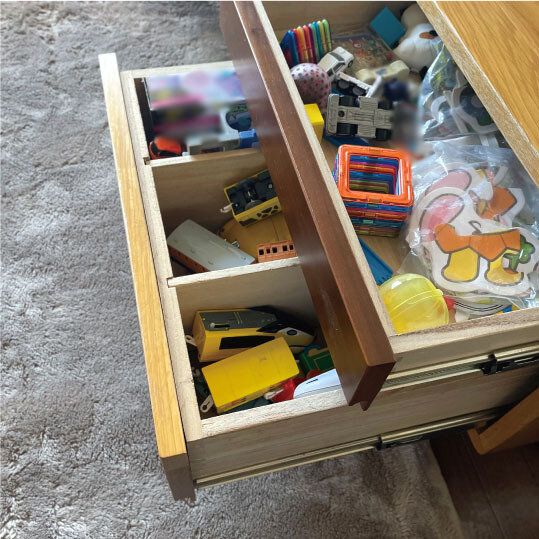 しかし現実は、1日に何度もおもちゃを出しては散らかす毎日。そんな使用頻度の高いおもちゃをキレイに片づけても疲れるだけだと思った筆者は「ざっくりしまうだけ」にチェンジ。