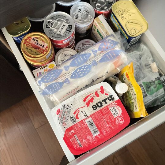 そこで、実践しているのがカテゴリーも収納も「ざっくり分ける」方法。「長期保存用の缶詰は引き出しの奥、レトルトは引き出しの手前」など、ざっくりカテゴリーをまとめて収納するだけ。