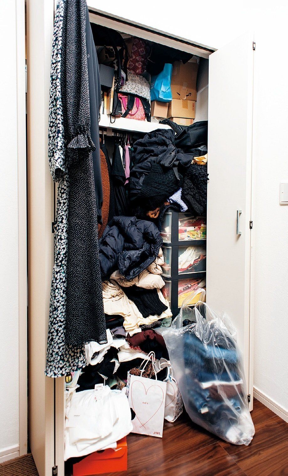 10年前の引っ越し後、新しい服を買うたびに上から詰め込んでいたというクローゼット。