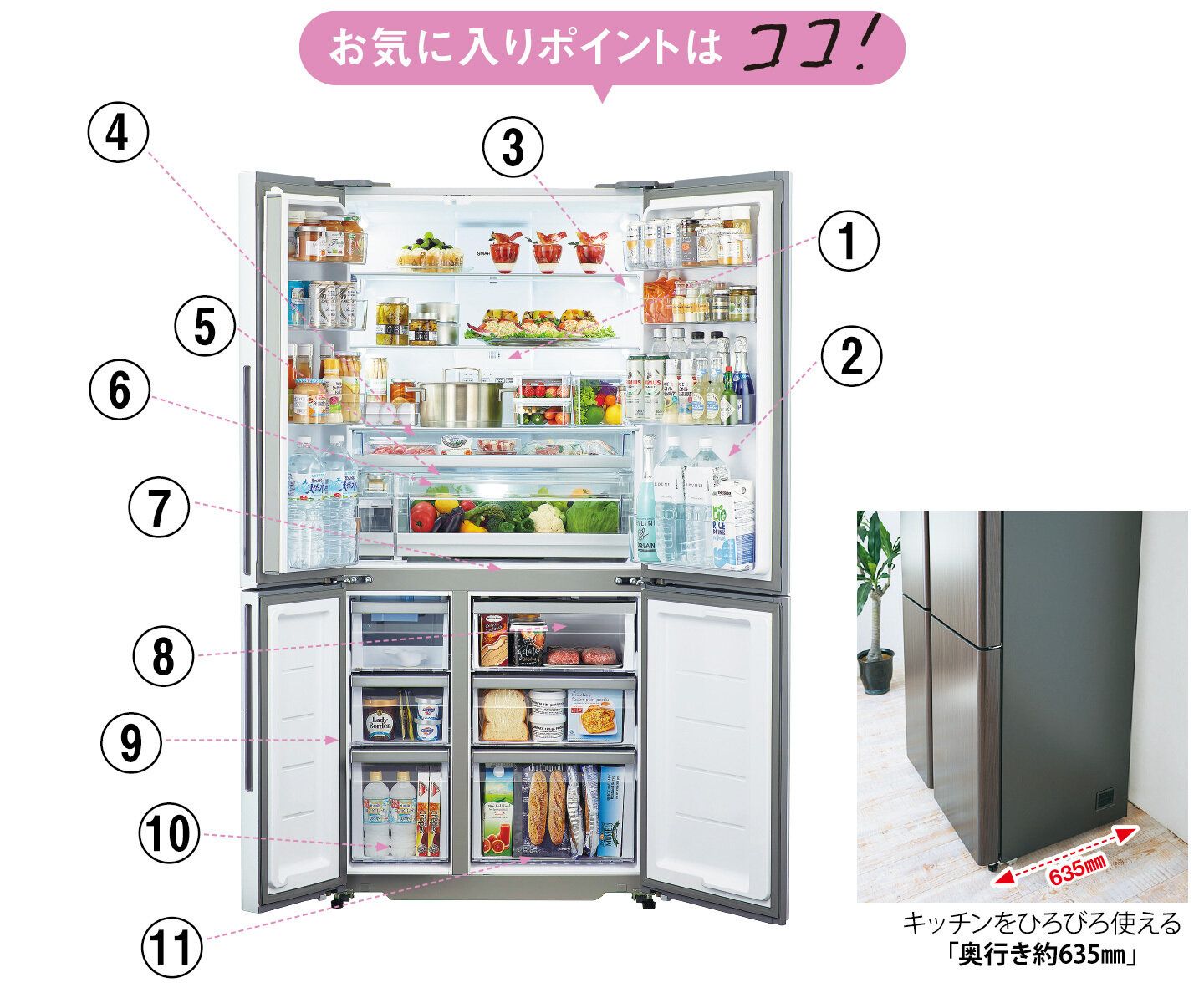 ④「幅約66cm」のワイドチルドルーム*510ℓのモデルのみ