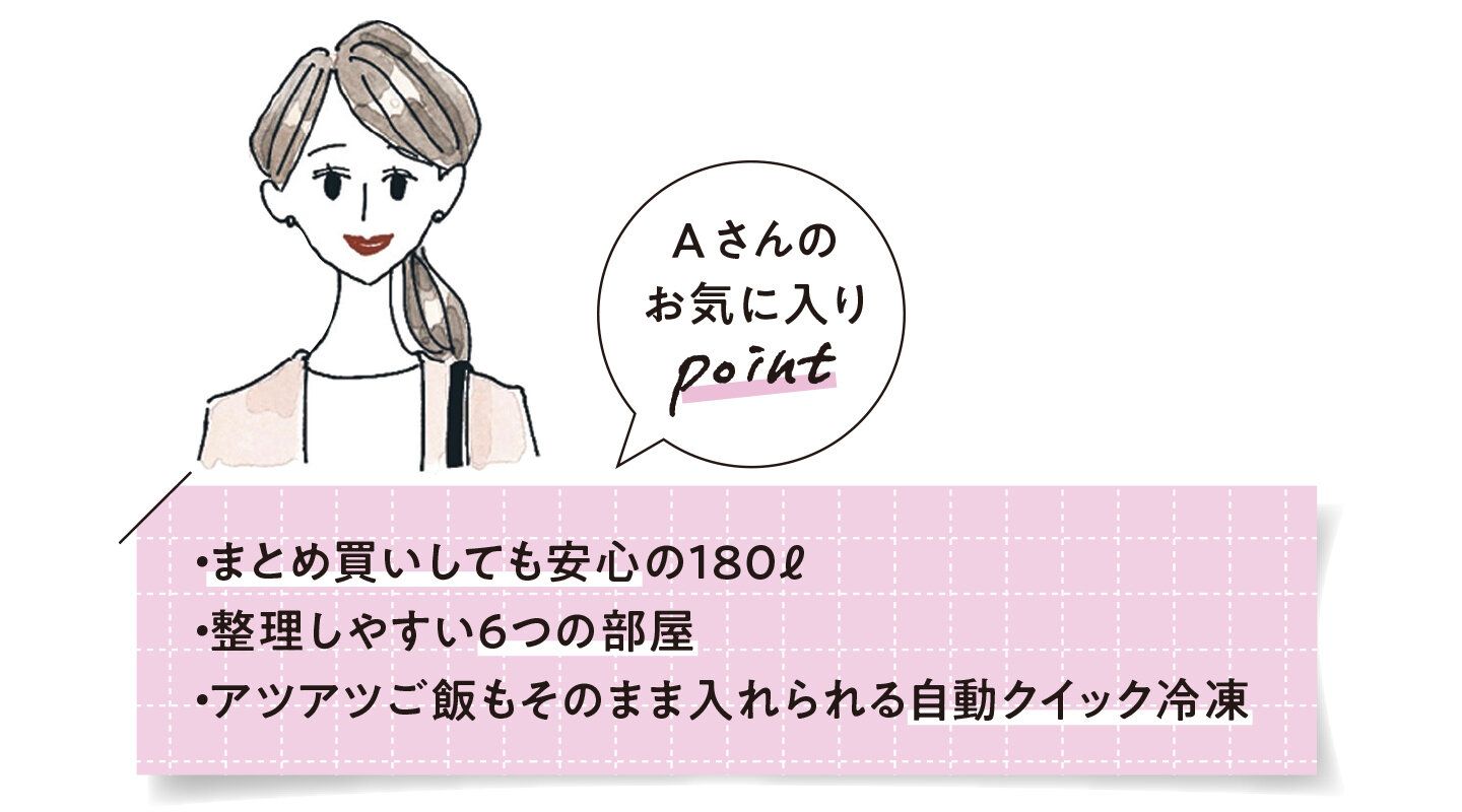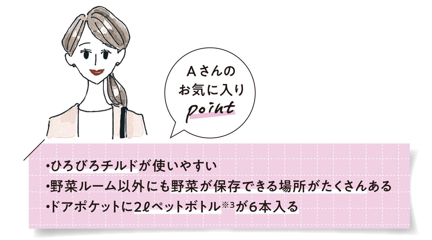 「スタイリッシュなデザインで、部屋のアクセントになってくれています。野菜室は見た目以上に大容量で、野菜好きな私にぴったり!」