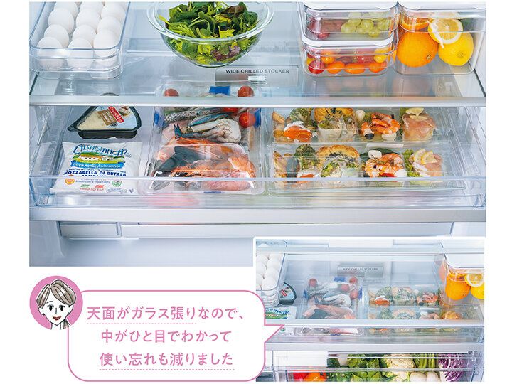 常備食材のハムやチーズ以外にも、生鮮食品や盛り合わせ料理など、何かと利用頻度が高いチルド。冷蔵室の横幅をフルに使ったワイドサイズだから、トレーを重ねたり斜めにしたりせずともすっぽり収まります