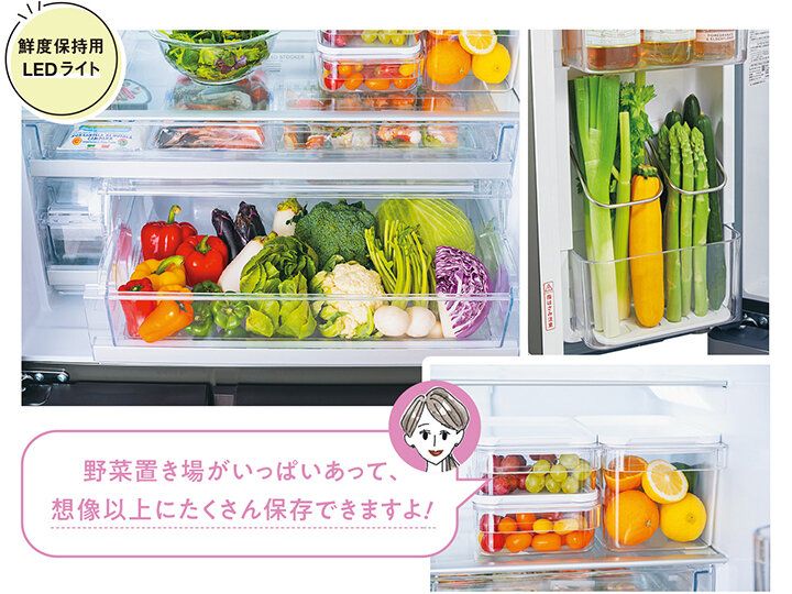 温度変化を抑えて乾燥を防ぐ野菜ルームの他にも、ドアポケットに高さのある野菜を立てて保存できる野菜スタンド(※4)があったり、使いかけ野菜をラップせずに保存しても鮮度を保ってくれるフレッシュ野菜ケースがあったり。野菜好きも大満足!
