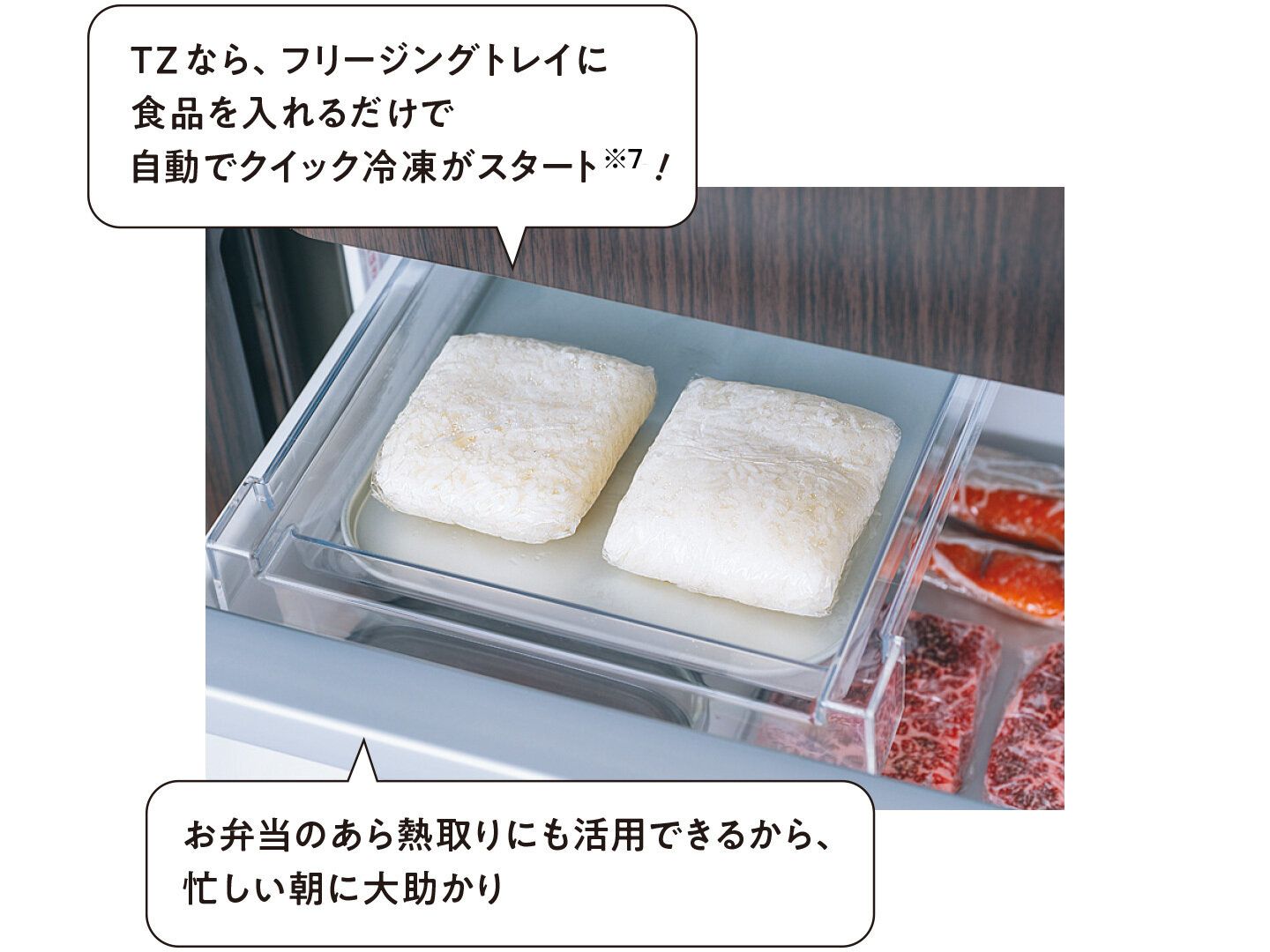クイック冷凍ですばやく冷やす! アツアツご飯もラップで包んだら、冷まさずそのまま入れてOK(※6)