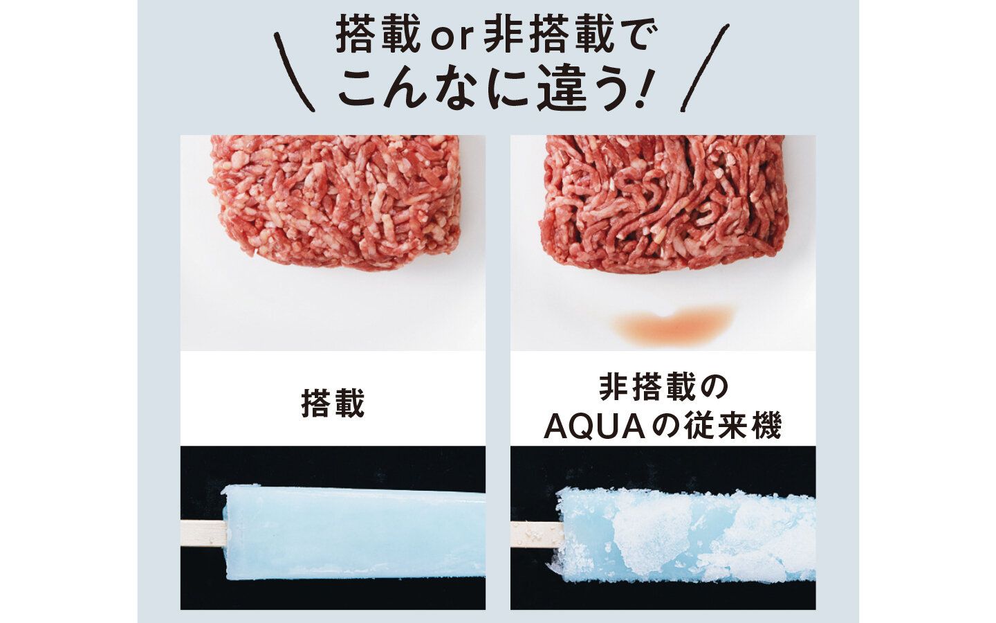 冷凍食品についた霜は、食材から逃げ出した水分やうまみ。ということは、「霜=おいしくないサイン」なんです。おいシールド冷凍なら、解凍したお肉でもドリップが出にくく(※9)、アイスの霜(※10)もこの通り!