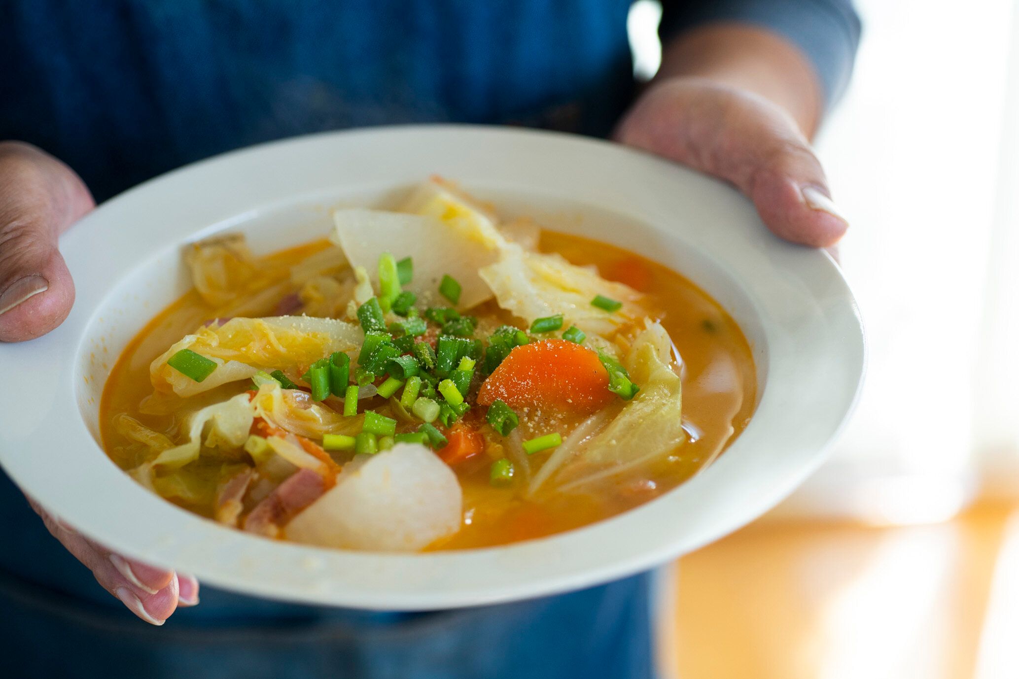 「野菜室を見て、先に使ったほうがいい物を選んで作るの。野菜はなんでもいいんだけど、ベーコンとニンニクはほしいな。野菜はざくぎりでいいよ。最初につぶしたにんにくをオイルで炒めて、ベーコンを炒める。そこに水を入れて、野菜と鶏ガラスープを入れて煮るだけ。味付けは塩、こしょうのみだ。ロシア流に押し麦を入れたり、パスタやそうめんを入れるときもあるよ。酸味が欲しければ、トマトやレモン、酢を入れると、目覚めがよくなるよ!」