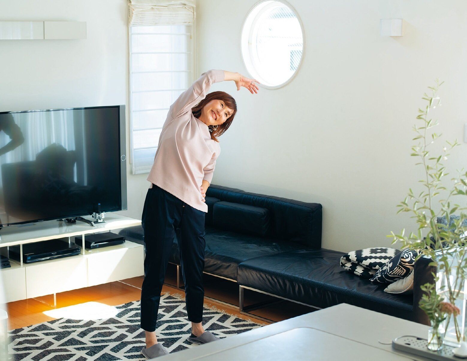 「息子たちが小さい頃からの習慣で、毎日ラジオ体操をしています。いちいちリビングを片づけなくてもすぐできるのもラク」。その成果か、今でも肩凝りの悩みとは無縁!