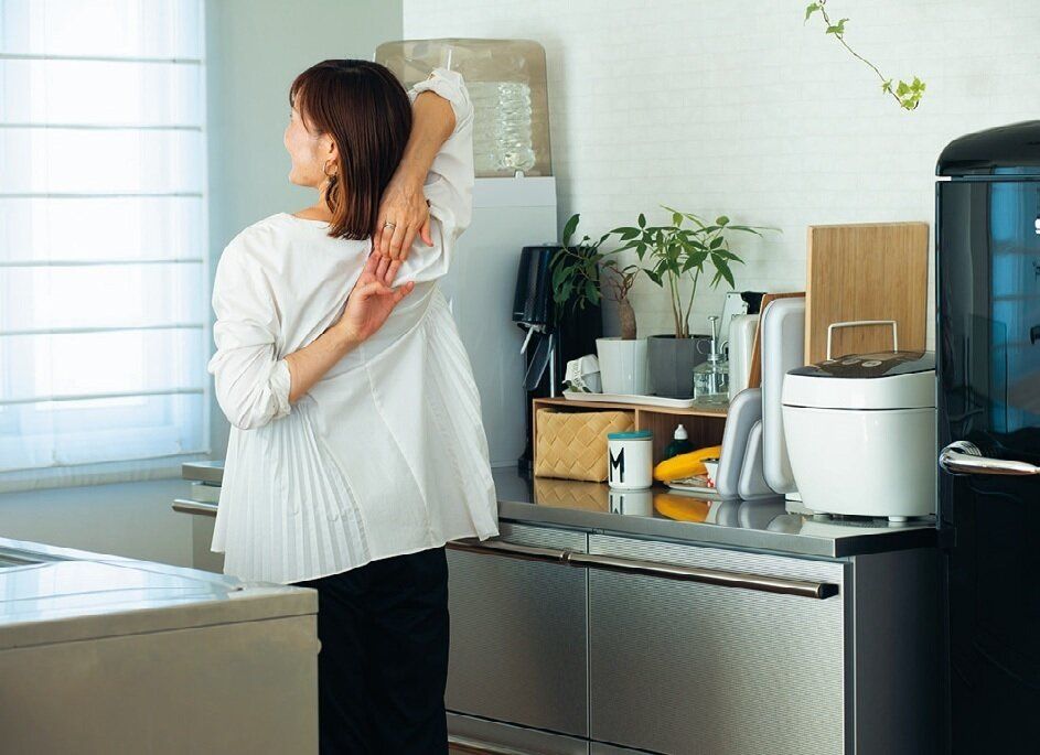 調理中など、隙さえあればストレッチを。「カウンターに余計な物を置いていないので、腕を回したりしても問題なし!50代になっても姿勢がいいと褒められます」。
