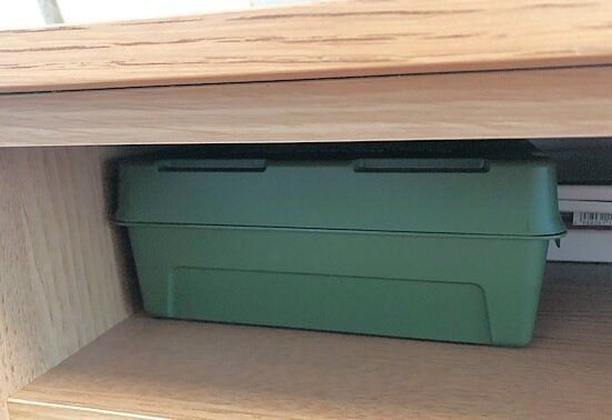 フタ付きの箱に入れてテレビボードに。