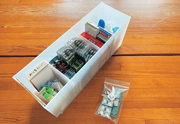 治療中に飲んでいる薬は、かごなどに入れてダイニングに出しっ放しでOK。余ったら、そのまま処分を。常備薬は処方されたままだとかさばるので、必ず袋から出してケースに入れて。区切りがある収納なら、種類別に分けられて◎。