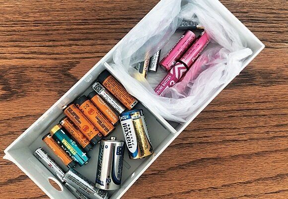 浅い引き出しや箱を電池ボックスに。手前を予備の電池入れ、奥を使用済みの電池入れにして区切っておけば、交ざる心配なし。さらに新しい電池を取りに来たときに、使用済みの電池を戻す習慣を家族につけてもらうと◎。
