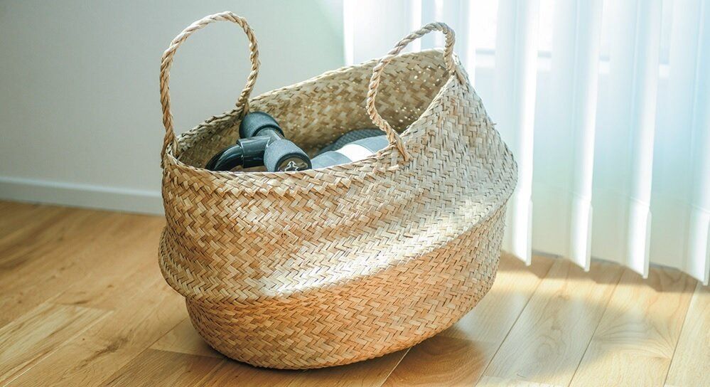 隙間時間にリビングで体を鍛えている夫。筋トレグッズのバーベルなどはしまい込むと使いにくく、表に出すとインテリアから浮いてしまいがち。そこで部屋になじむおしゃれなかごで目隠し。夫も自ら戻すように。