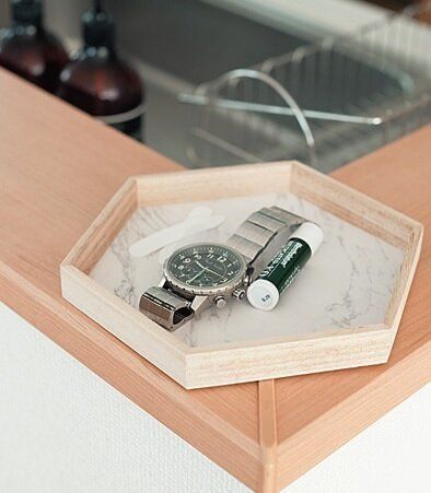 帰宅後、無意識にあちこちに置くから「俺の時計がない」となりがちな夫の小物。夫が身支度のとき必ず通るキッチンカウンターに、夫の小物専用のトレーを置いたら探し物問題が解決。