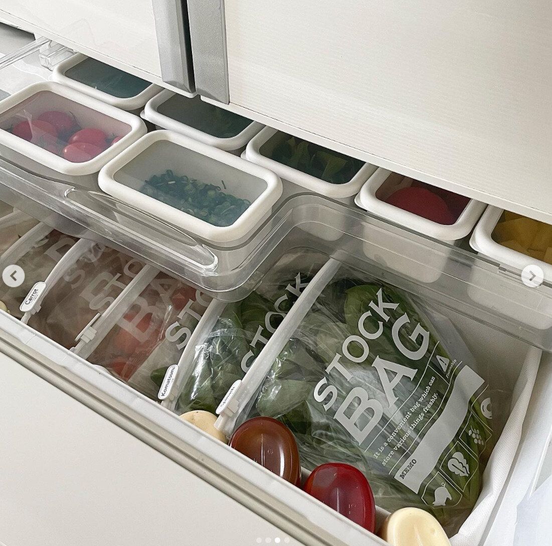こちらは、上段にホーロー容器、下段に野菜保存袋+スライダーバッグを活用した野菜室収納のアイデアです!食材を仕分けながらフレッシュさをキープできるのがうれしいところ。これならたくさん買い物をしても安心です。クリアな見た目で、中身がわかりやすいのもよいですね!