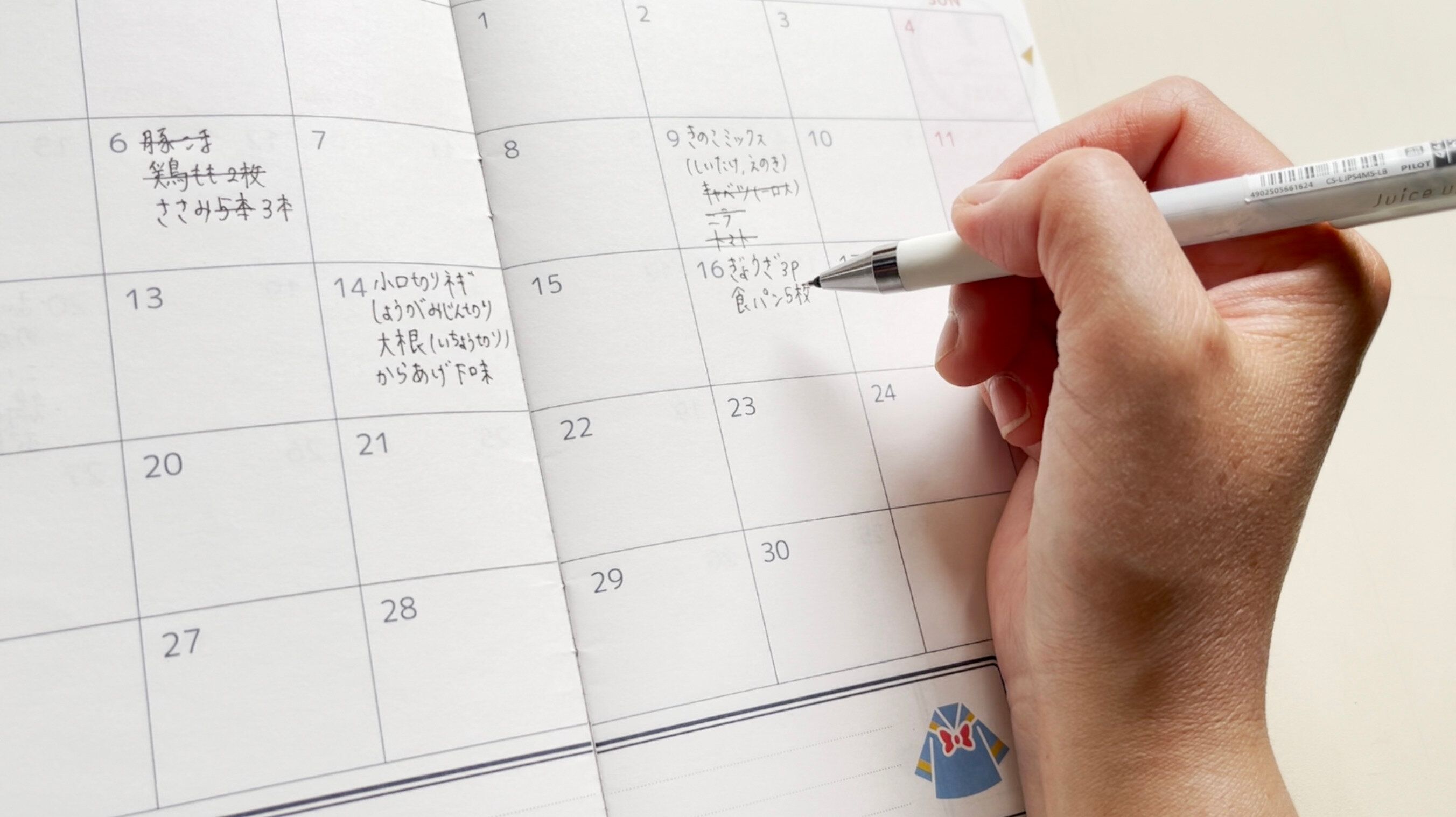 冷凍した食材があれば、カレンダーに食材名を書き込みます。これがあれば、いつ冷凍したのかひと目でわかります。