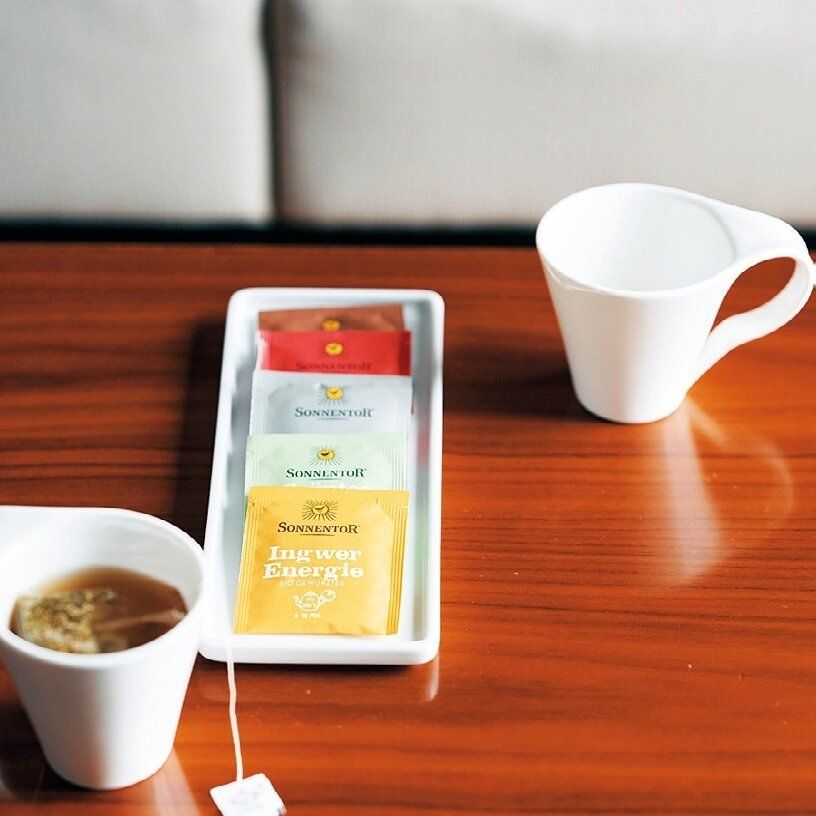雑然と掛けたり置いたりしがちなハンガーや冊子は、向きや角をそろえて並べるだけできちんと見えるもの。ティーバッグは、見やすく取りやすいように、少しずつずらしてセット。「タオルは左右の端を内側に折り込み、端を後ろにして重ねると美しく見えます」(飯田さん)。