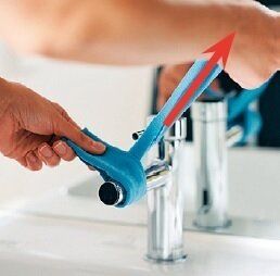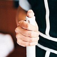 きき手の親指で柄の先端を押さえ、もう片方の手で柄をしっかり握るのがポイント。