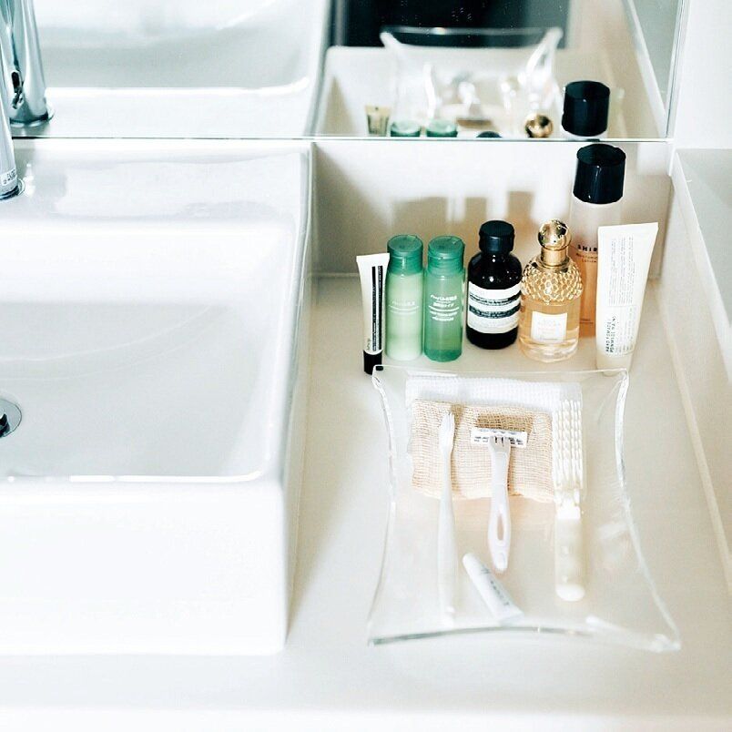 小さな物は一番見えやすい位置に。歯ブラシは取りやすい場所に。お客さまの気持ちになって整えます。