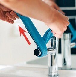 マイクロファイバータオルを折って蛇口に巻き、左右にキュッキュと動かすと洗剤なしでもじゅうぶんキレイに。タオルをクロスするのがポイントで、力が均等に行きわたり、磨き残しがない。最後にバーを拭いてフィニッシュ!