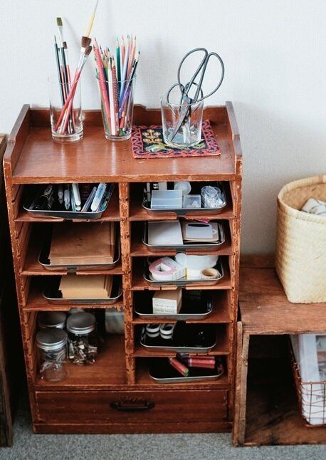 文房具もキッチン同様、「こうしたい」というイメージ先行で置き方を検討。「お店みたいに並べたら、出し入れが楽しくなりました」。トレーごと出して、使う場所に持ち出しています。