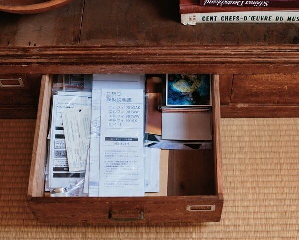 無理をしても続かないので、取説やレシートなどは引き出しだけ決めて、どんどん入れる簡単方式に。1カ所にまとまってさえいれば、内部を細かく整理しなくても困りません。