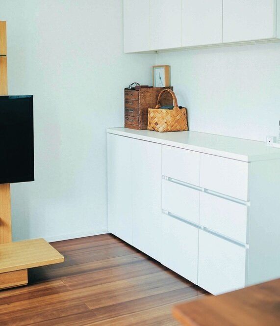 床やテーブル、棚の上にも物がなく、すっきり感にあふれたhanaさんのお宅。めざしたのは、シンプルでスムーズに家事を進められる空間だったそう。「探し物が嫌いなので(笑)、物も収納法もシンプルが理想。使い勝手が悪い物、色が気に入らない物は、結局使わないからと断捨離したんです」。不要の基準がはっきりしたことで物が増えなくなり、好きな物だけに囲まれた理想の住まいになりました。