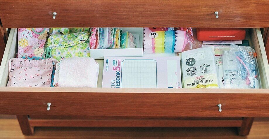 ダイニングの引き出しを、学校の工作や大掃除で使うスポンジや洗濯ばさみ、ぞうきん、さらにノートなどのストック場所に。前日の夜や当日に言われても、慌てずに持たせられます。