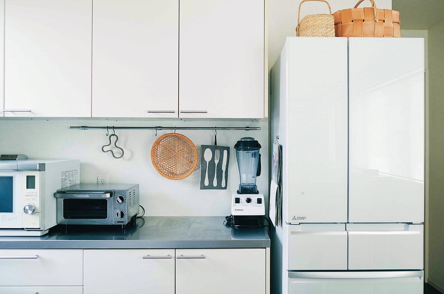 出しっ放しになる家電や収納グッズは、モノトーンやシルバー、木製と、色や素材を厳選。お菓子やウエス代わりの布など、色みの強い物は冷蔵庫の上のかごに隠して、すっきり!