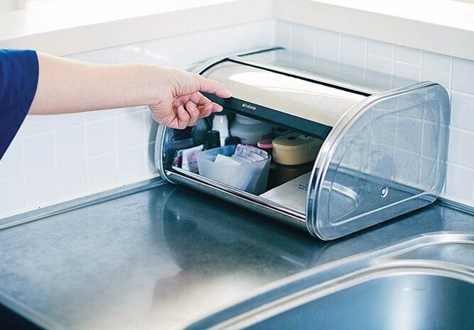 サプリメントや子どもの歯の矯正器具など、色みが強くこまごました物は「ブラバンシア」のブレッドビンへ。パッと隠せて便利。