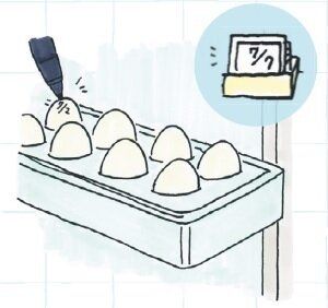 豆腐や納豆は目に入りやすい手前のパッケージのフタに賞味期限を書いて並べ、奥から使用。よく使う卵は一番奥の1つに日付を書き、手前から使うと次に買うタイミングが見えて◎。油性ペンも一緒に入れておくと便利です。