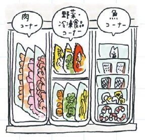 冷凍室はいわば深い引き出し。肉や魚など薄い食材を上に重ねて入れると下の物が見えず存在を忘れがちです。かごやブックエンドで仕切り、種類別に立てて入れると取り出しやすくて使い忘れもなし!