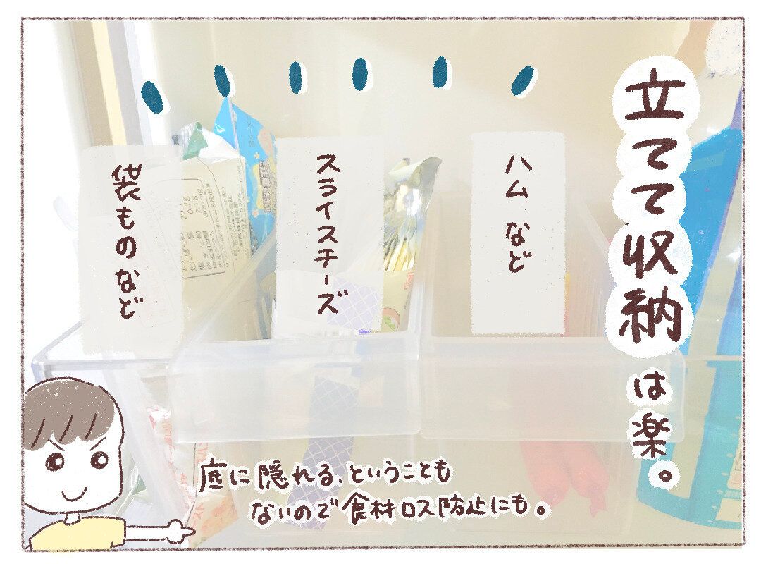 スライスチーズやハムなどの平たいものは「立てて収納」が便利。