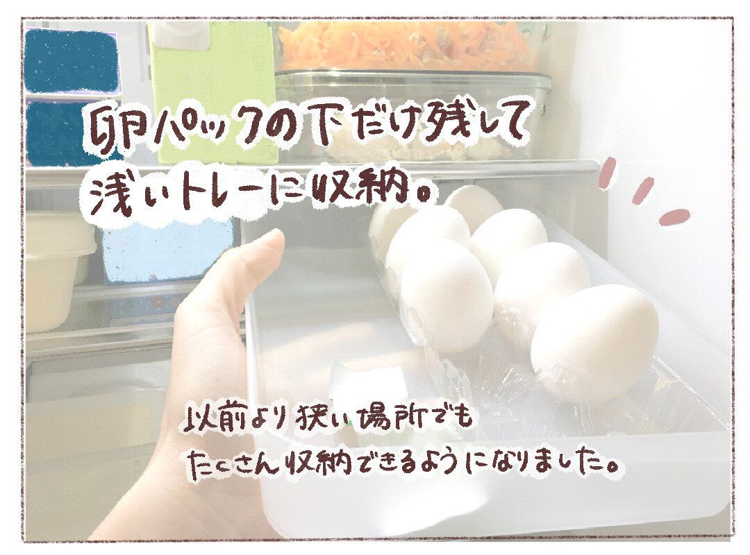 我が家では卵が数個余った状態で新しい卵を購入するので、幅広の浅いトレーを使用しています。下半分の卵パックを使うことで安定しますし、横に余っていた卵を置けるので格段に使いやすくなりました。