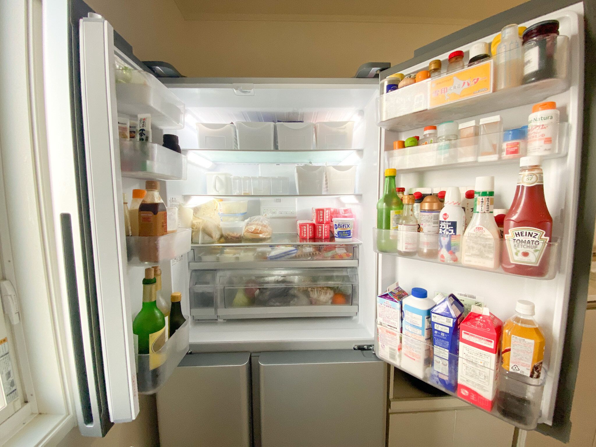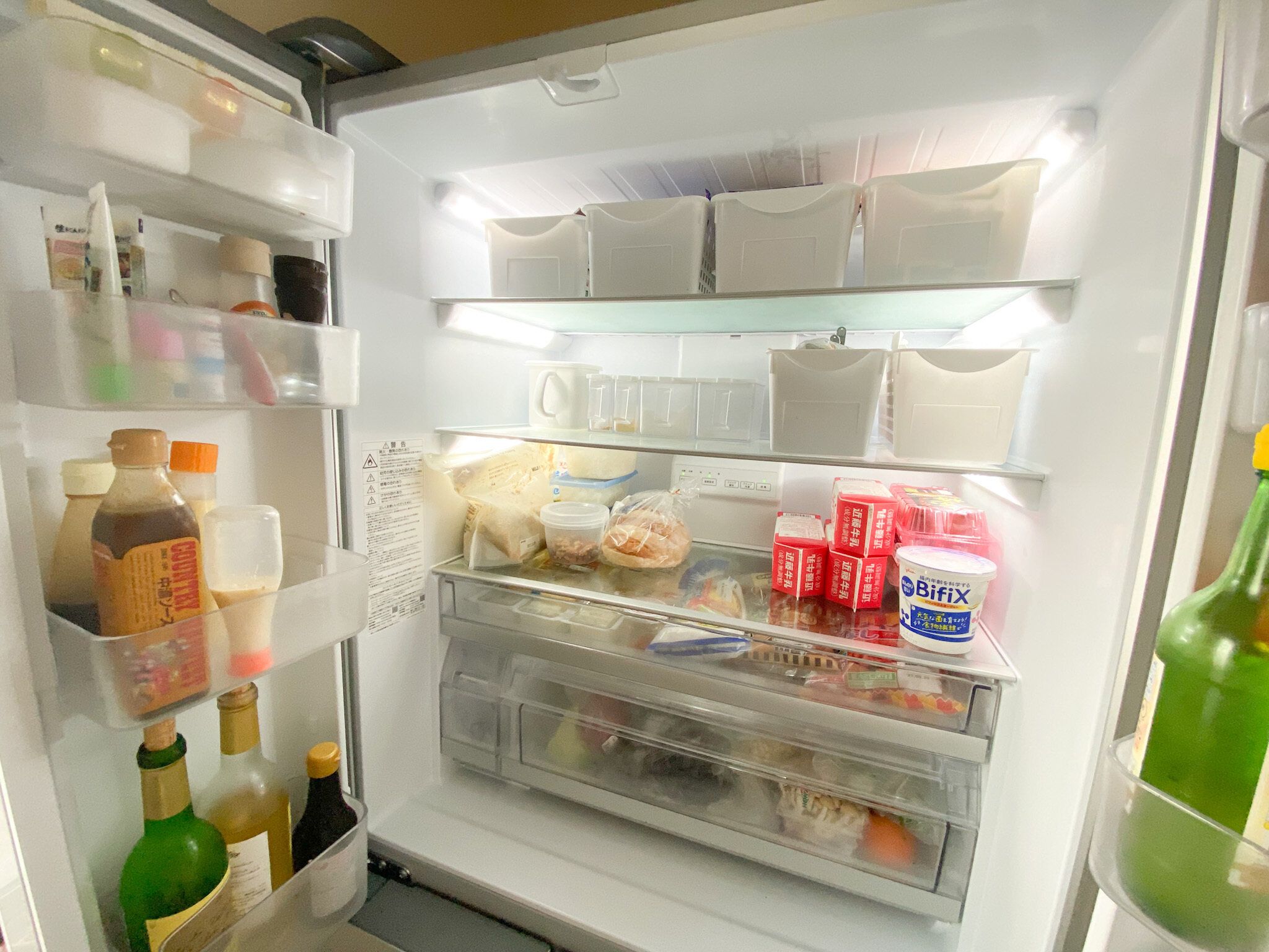 コストコで買った大容量の飲料などを箱ごと入れても全然余裕です。しかも、我が家ではダニ対策のため調味料や開封済みのパンやお菓子などすべて冷蔵庫の中に収納しているので、冷蔵庫に入れるものが多いのですが、それでも余裕で収納できてしまうのでとても助かっています。