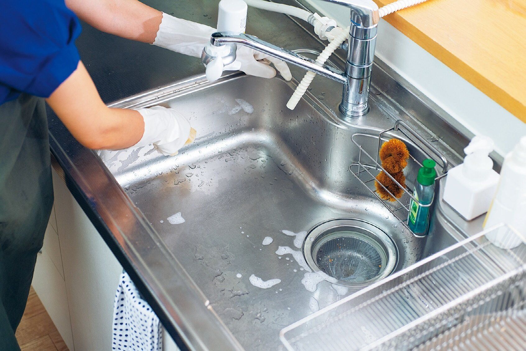 水切りかごはトレーに水がたまりにくい傾斜つき、スポンジは目が粗いもの。水切れがいいだけで水回りのヌルつきは減ります。