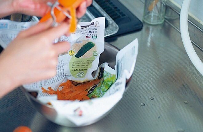 野菜くずをそのまま排水口に捨てるとにおいの原因に。調理中、チラシなど雑紙を敷いたボウルに皮などを集め、水気を切ってからゴミ箱へ。