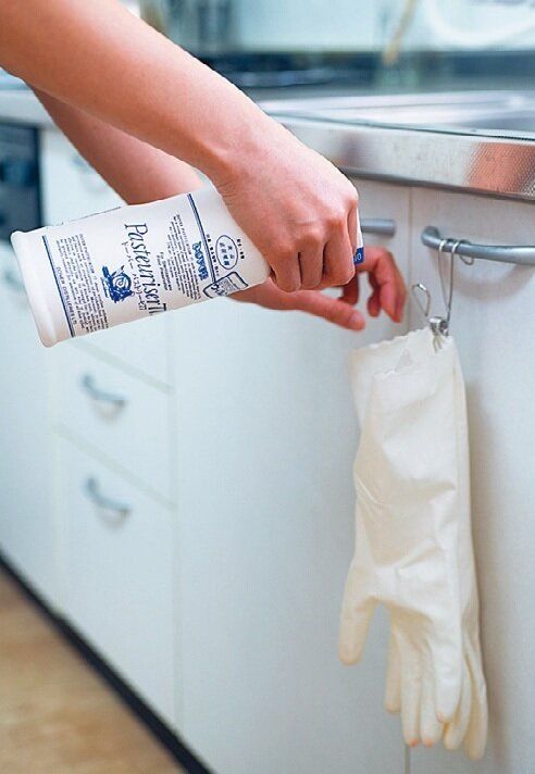 使ううちに内側がにおってくるゴム手袋はアルコール除菌。「寝る前に片手につき2回スプレーするだけで、翌朝も気持ち良く使えます」。