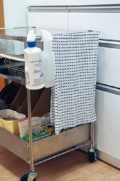 近くのキッチンワゴンにウエスを常備し、食器の汚れを拭いて予洗いしてから食洗機へ。シンクや排水口の油汚れがグッと減ります。