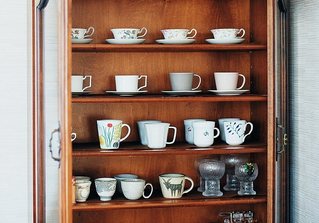 「昔は来客も多く、かなりの数の食器がありましたが、一人暮らしになってからは最小限に。かつて使っていた食器の一部は息子夫婦に譲りました」。自分好みのカップ類は棚に入る分だけ残し、ながめて楽しんでいます。
