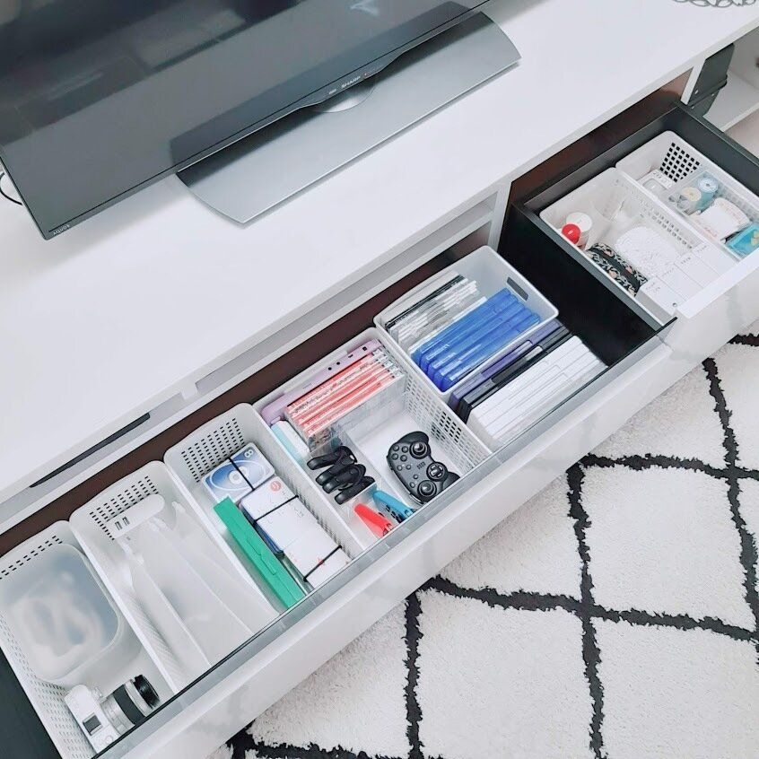 我が家のリビングの収納スペースは、テレビ台、引出し(無印良品)、白いラック(イケア)のみ。その中に厳選して置くのは、家族がリビングで共通するアイテムのみ。個人のものを置くと散らかる原因になるので基本は置きません。