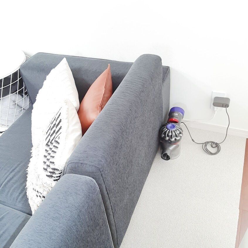 掃除機はソファの後ろに置いているので、目立ちません。むしろ近くに置いてあることで、すぐ手に取りやすく、掃除のハードルが低くなるという効果もありました。