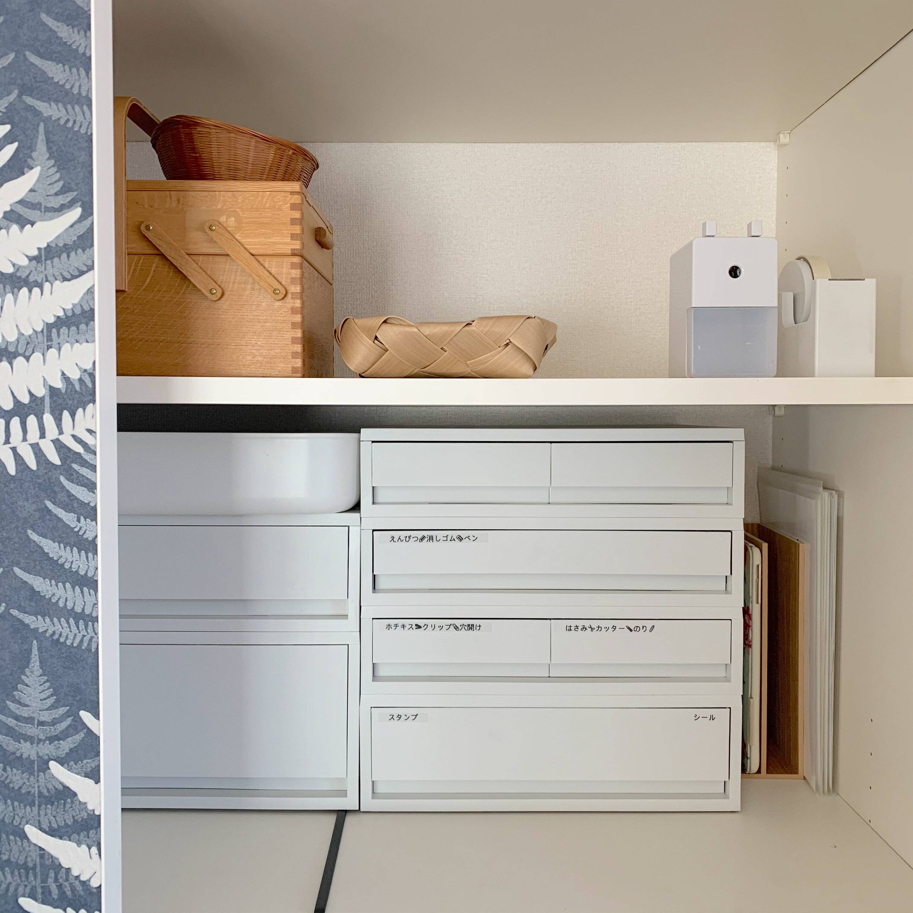 今までは、文房具を隠して収納していました。引き戸の収納の少し高い所に引き出しケースを入れ、その中に鉛筆やペン、ハサミ、テープなどの文房具を収納していたのです。小さい子どもには危険な文房具もありますし、無駄に使ってほしくはありません。子どもたちが触らないようにと、目に付きにくい場所に隠していました。