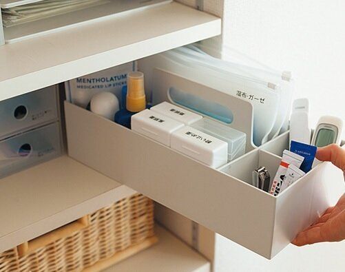 薬や爪切りなどの日用品は縦長のケースに収納しています。出番の多い物はケースの手前、あまり使わない物はケースの奥へ。よく使う物を手前に集めて収納するだけで、使いやすさがアップ!