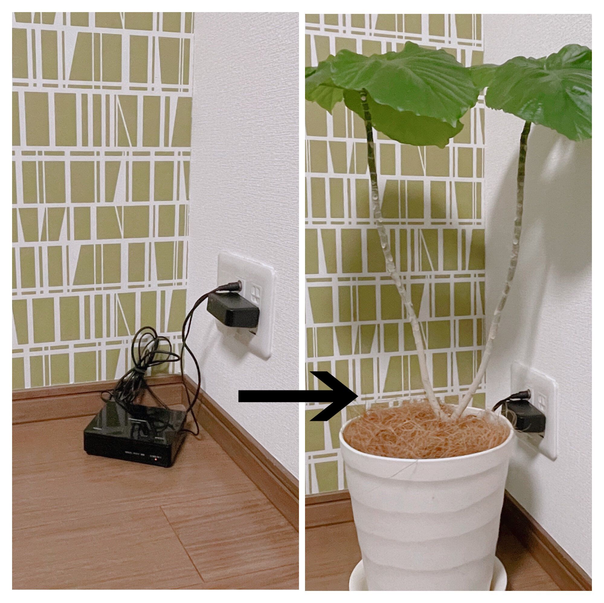 配線コードが剥き出しのままでは、ごちゃついた印象になりますが、隠すだけで、すっきりした印象になります。細かい作業は不要です。わが家では、観葉植物を手前に置いているだけの簡単スタイルで配線対策をしています。