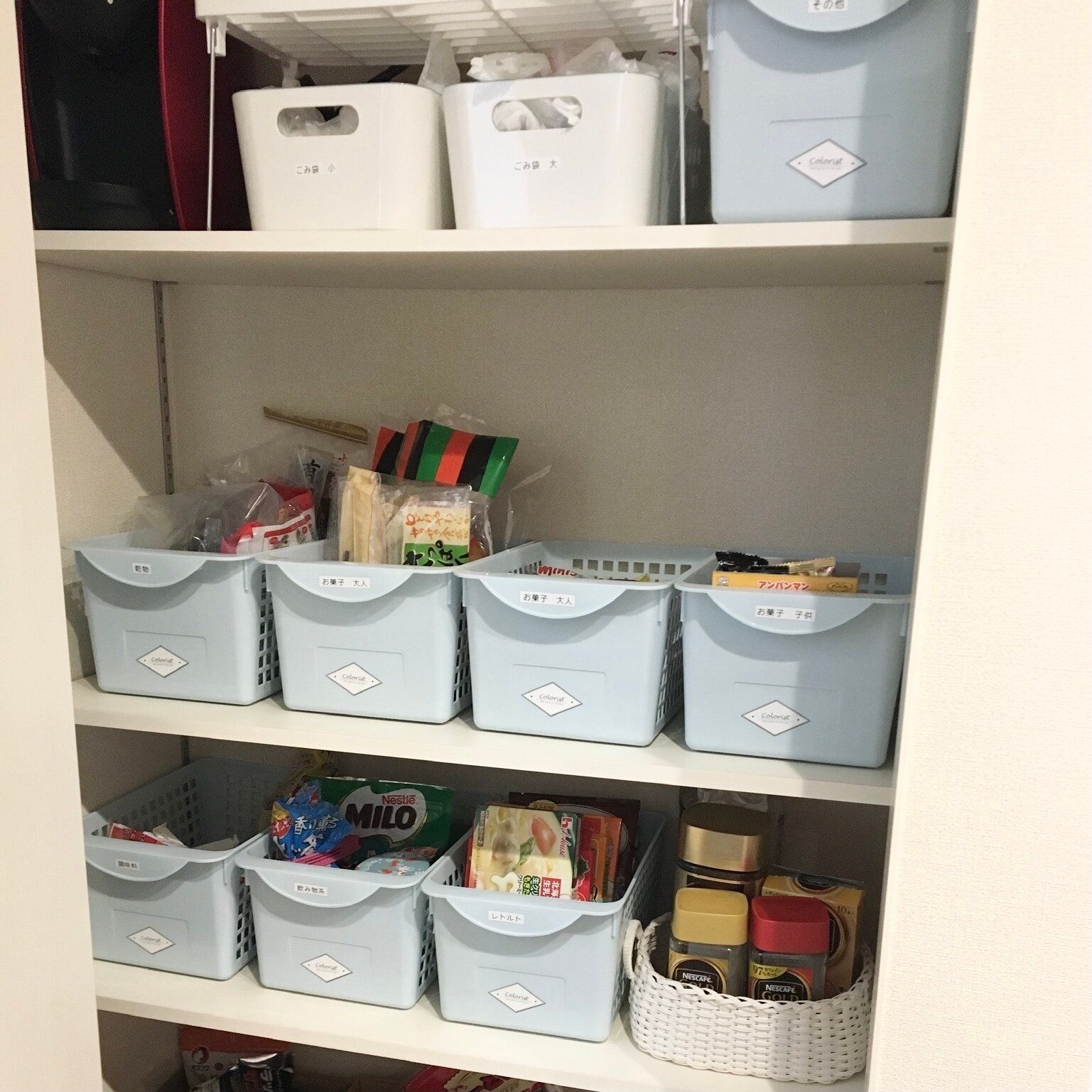 気付いたら賞味期限が切れてしまっている食品、想像以上にあると思いますよ!残ったモノも、種類別に分けて定位置をラベリングしておくと、在庫管理もしやすくなります。